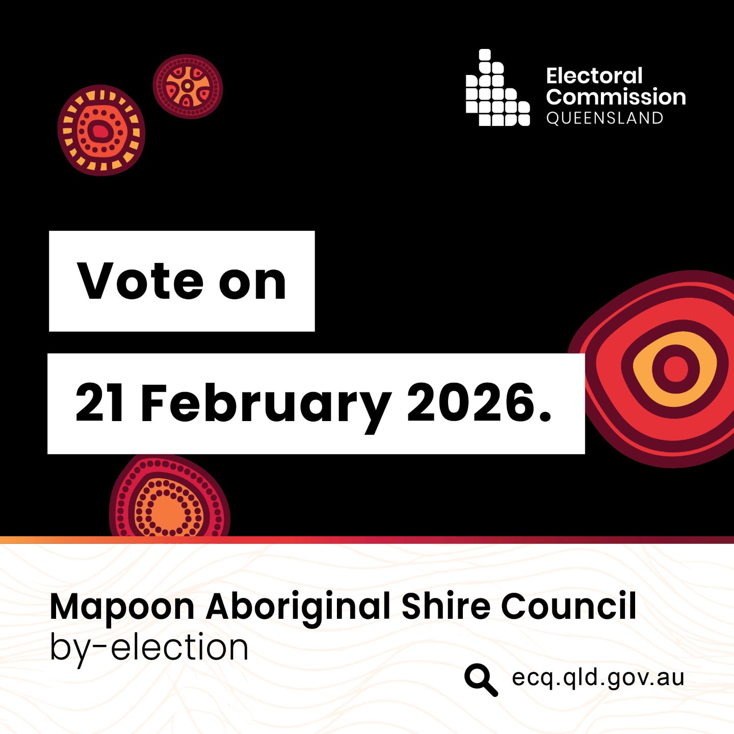 Election day is Saturday 21 February 2026. Voting is available at the Mapoon Cultural Centre, 1 Red Beach Road, Mapoon from 8am to 6pm.