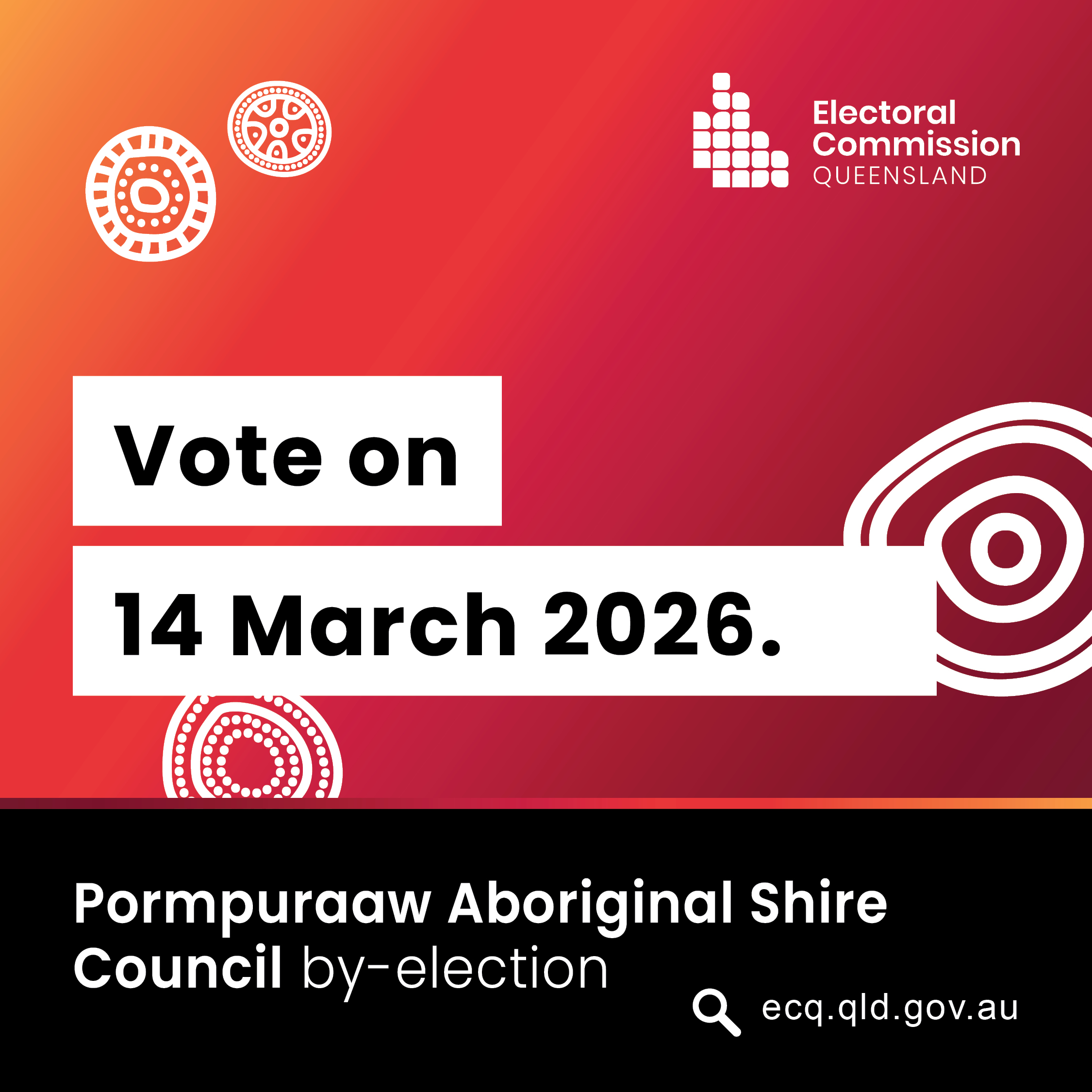Election day is Saturday 14 March 2026. Voting is available at the Pormpuraaw Justice Centre, 24 Yalu Street, Pormpuraaw from 8am to 6pm.