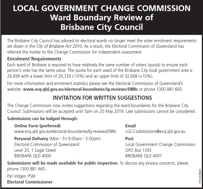 The Change Commission finalised its review of the Brisbane City Council's ward boundaries in 2019. The final determination report and maps can be viewed in the table below.